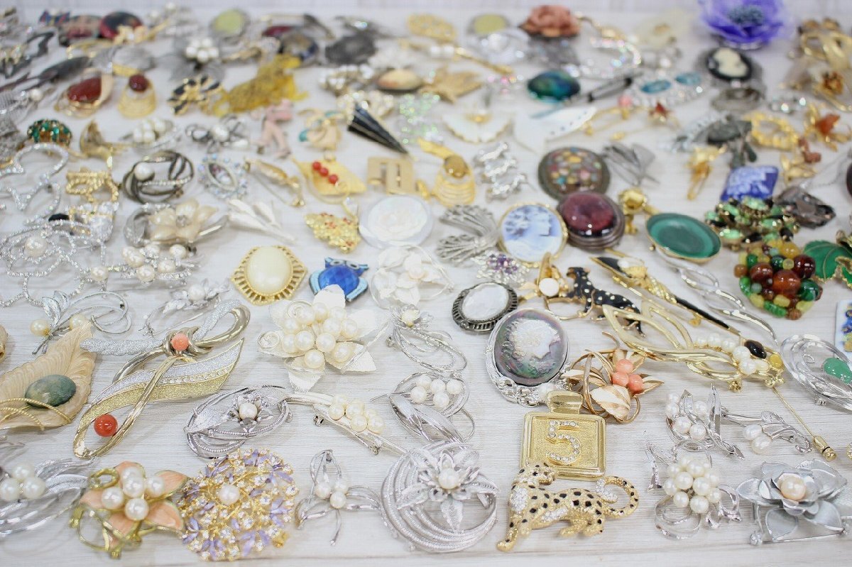 パールや真珠、サンゴ、珊瑚、シルバーなど様々な素材のブローチが含まれており、総数は約250点という豊富なコレクションでした。これらのアクセサリーは時代を超えて愛され続ける上品なデザインのものが多く、パールや珊瑚といった天然素材の美しさが際立っています。長年大切に保管されてきたお品物ばかりでした。