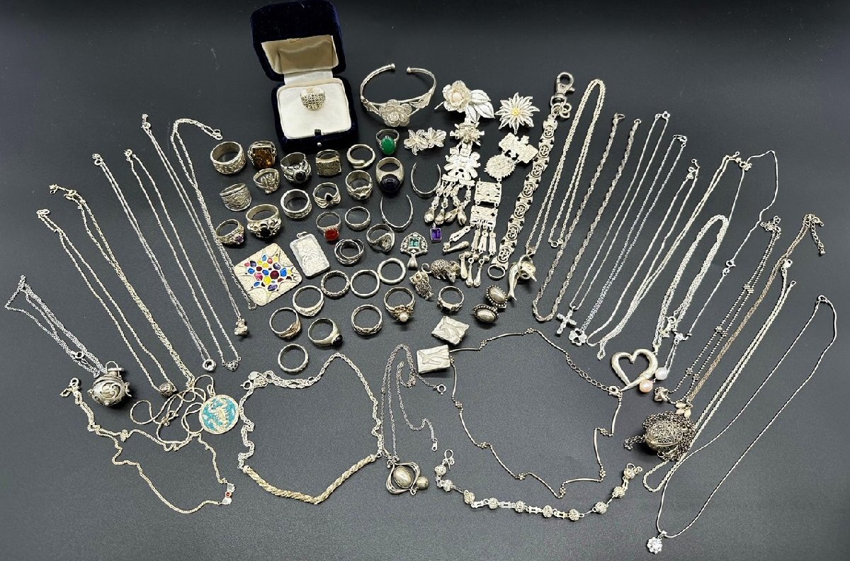 こちらは925刻印入りの本格的なシルバーアクセサリーコレクションです。ネックレス、リング、チャーム、ストーン付きアクセサリー、ブレスレットなど様々な種類のSV925製品が含まれており、シルバー製品としての価値を持つお品物でした。925刻印があることで、品質が保証された銀製品であることが確認できます。