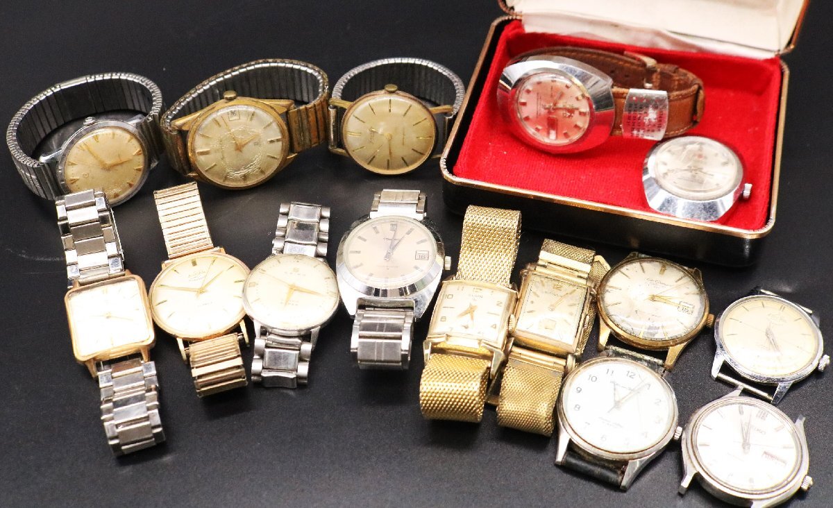 アンティーク腕時計のまとめセットをお買取りさせていただきました。SEIKO、ELGIN、ENICAR、CYMA、BRITIXなど、様々なブランドの時計が含まれています。