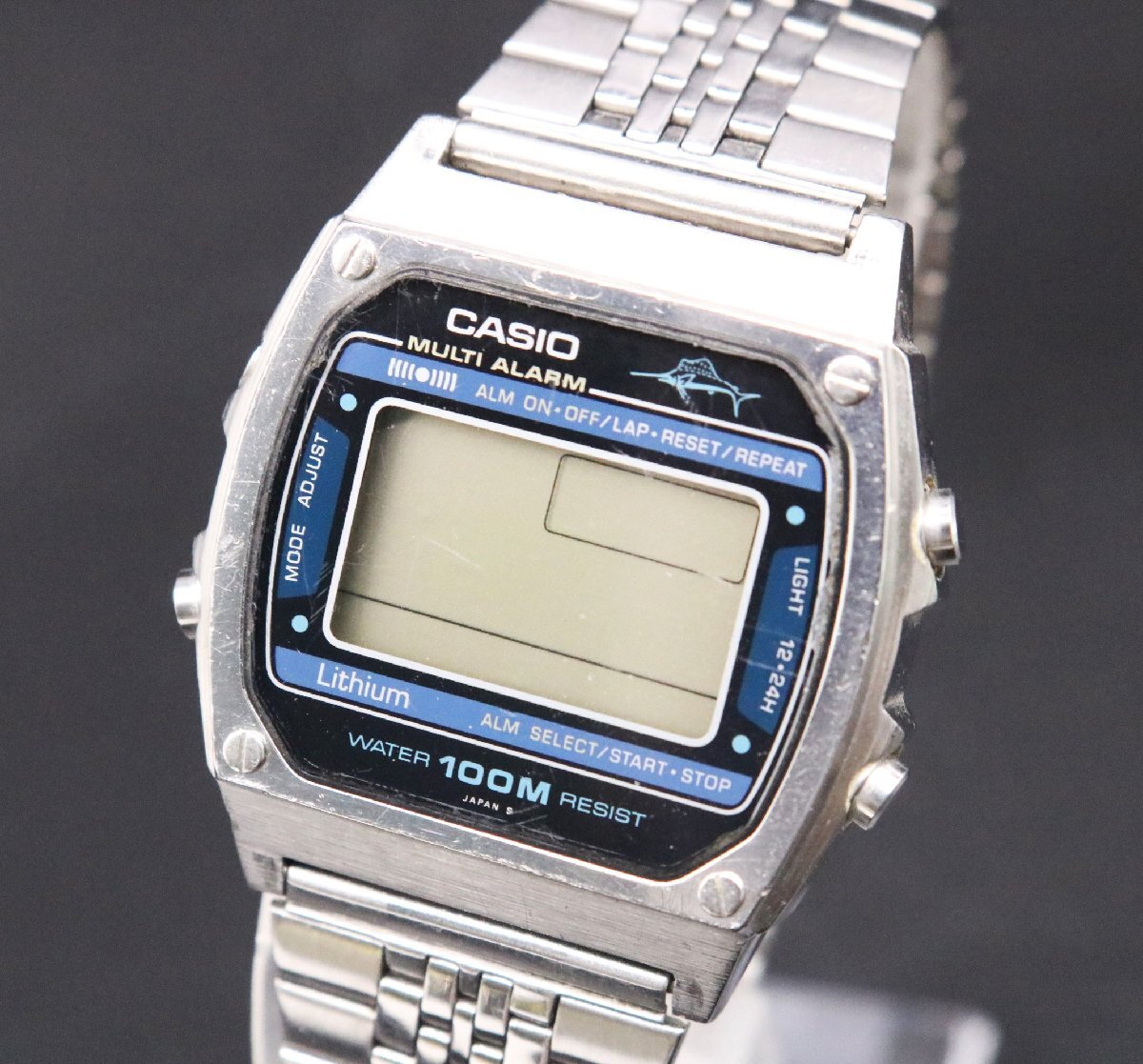 カシオは日本を代表する時計メーカーで、デジタルウォッチの分野で多くの人気モデルを展開しています。今回お買取りした品はマルチアラーム機能付きのスポーティなデザインで、カジキがデザインされた特徴的なモデルです。傷や汚れがあり、裏蓋が固着しており現状動いておりませんのでジャンク品の可能性がございますが、修理を前提に時計愛好家の方にご活用いただける品です。