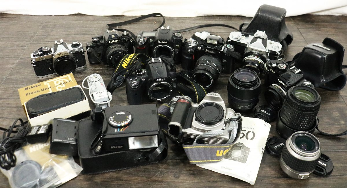 D50、D5000などのデジタル一眼レフカメラから、FM2、F60といったフィルムカメラまで、幅広い年代のNikon製品が含まれています。SB-3フラッシュやBC-7バッテリーチャージャーなどの関連アクセサリーも一緒にお預かりしました。現状品としての買取でしたが、カメラ愛好家の方々に大変人気の高いブランドです。