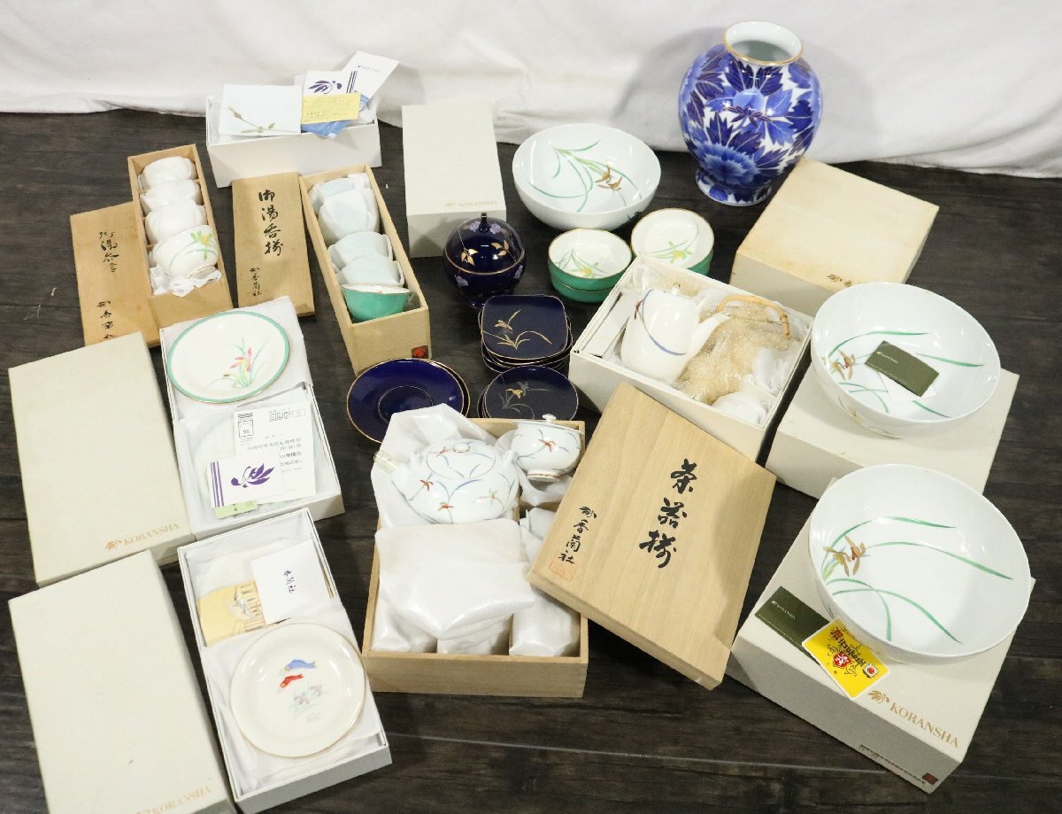 香蘭社は有田焼の老舗メーカーで、明治時代から続く伝統ある陶磁器ブランドです。今回のお品物は、月ごよみや貴婦人といったシリーズのプレートやカップ、銘々皿をはじめ、深鉢、壺、急須まで含む豊富な食器セットでした。未使用保管品も含まれており、木箱付きの格式高いお品物もございました。