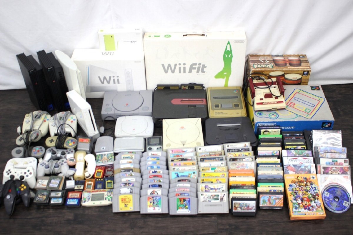 こちらはドリームキャスト、PlayStation3、PlayStation2、ニンテンドー64、ニンテンドーDS、Wii、スーパーファミコン、ファミリーコンピューターなど、多種多様なゲーム機とソフトのセットです。懐かしいレトロゲーム機から比較的新しいハードまで幅広く含まれており、ゲーム好きの方にとって貴重なコレクションとなる内容でした。
